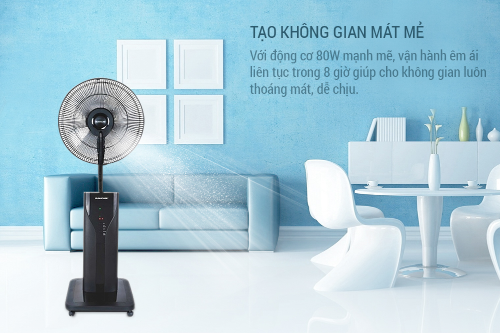Với động cơ 80W mạnh mẽ, vận hành êm ái liên tục phun sương trong 8 giờ giúp cho không gian nhà luôn thoáng mát, dễ chịu.