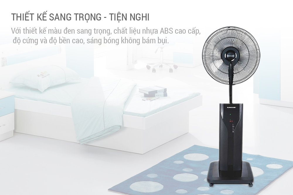 Quạt Phun Sương Sunhouse SHD7801 với thiết kế màu đen sang trọng, chất liệu nhựa ABS cao cấp, độ cứng độ bền cao, sáng bóng, không bám bụi. Kiểu dáng thân cao sang trọng, hiện đại, thời trang phù hợp mọi không gian nhà. Chân quạt có lắp bánh xe di chuyển tiện lợi, an toàn khi sử dụng.