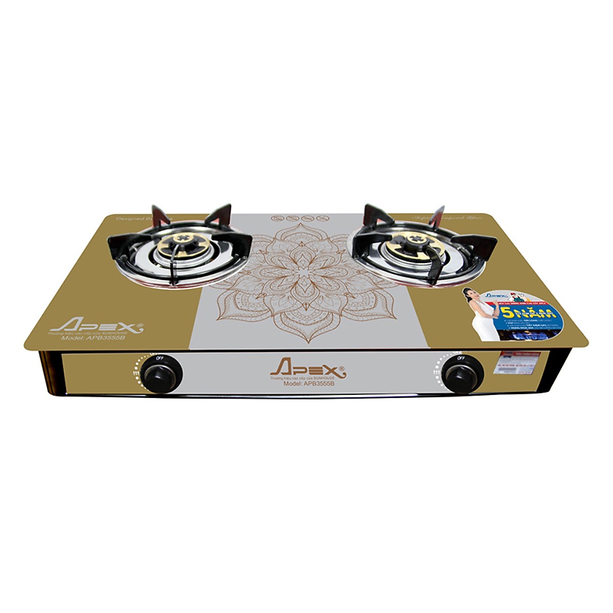 Bếp gas dương Apex APB3555B có kiểu dáng sang trọng hiện đại khi mà mặt bếp được làm bằng kính màu vàng kết hợp thêm hoa văn bông hoa chính giữa bếp làm bếp thêm tô điểm tạo điểm nhấn cho căn phòng của bản