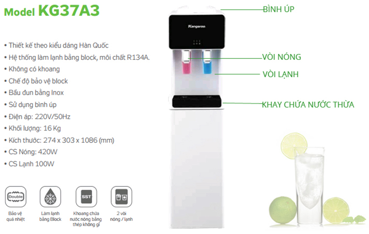 Máy nước nóng lạnh Kangaroo KG37A3 có hệ thống làm lạnh bằng Block nên độ bền cao, lạnh sâu đến 2 độ C. Sử dụng môi chất làm lạnh R134A, cho ra nguồn nước lạnh và đảm bảo nguồn nước luôn sạch sẽ, giữ vị ngon của nước, nguồn nước được bảo đảm an toàn tại vòi.