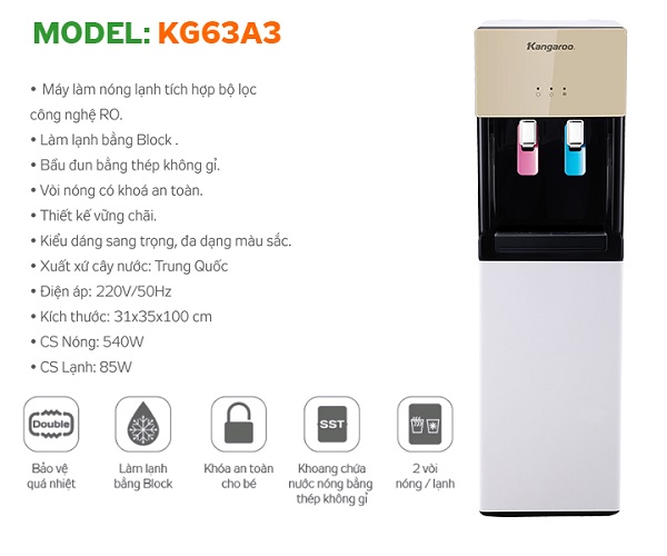 Máy làm nóng lạnh nước uống Kangaroo KG63A3 là thiết bị làm nóng lạnh nước uống của tập đoàn Kangaroo được tích hợp 2 trong 1 với chức năng làm nóng và làm lạnh nước trên cùng một sản phẩm rất tiện lợi.