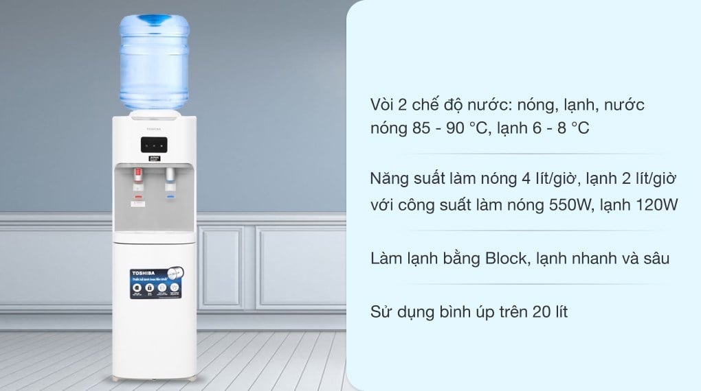 - Có nhiệt độ làm nóng nước từ 85 - 90°C, làm lạnh nước từ 6 - 8°C (trong điều kiện tiêu chuẩn)