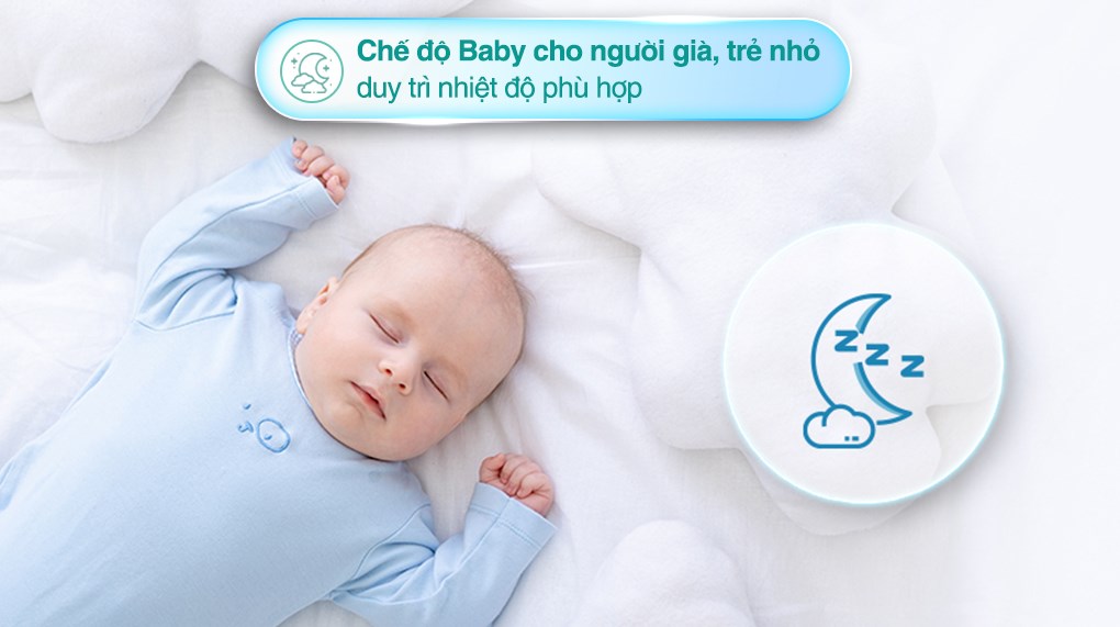 - Chế độ Baby khi được kích hoạt sẽ cho máy lạnh Casper Inverter này hoạt động êm ái và duy trì nhiệt độ phù hợp cho trẻ nhỏ, dao động từ 26 - 29°C.