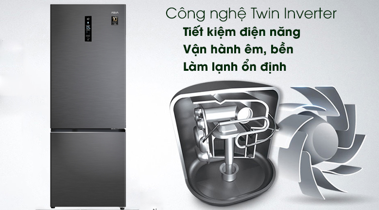 Máy nén Inverter có thể tự động điều chỉnh công suất hoạt động, vòng quay theo nhiều cấp độ, tùy thuộc vào từng thời điểm, tủ luôn được duy trì nhiệt độ ổn định mà không cần tắt bật lại như máy nén thông thường. Quạt Inverter hỗ trợ kiểm soát lượng khí lạnh được thổi đến các vị trí bên trong tủ tối ưu nhất. Tủ lạnh Aqua AQR-B339MA(HB) với công nghệ Twin Inverter sử dụng đồng thời máy nén Inverter và quạt Inverter giúp tủ có khả năng hoạt động hiệu quả với mức tiêu thụ năng lượng tối thiểu, ít tiếng ồn và làm mát nhanh chóng, mạnh mẽ.