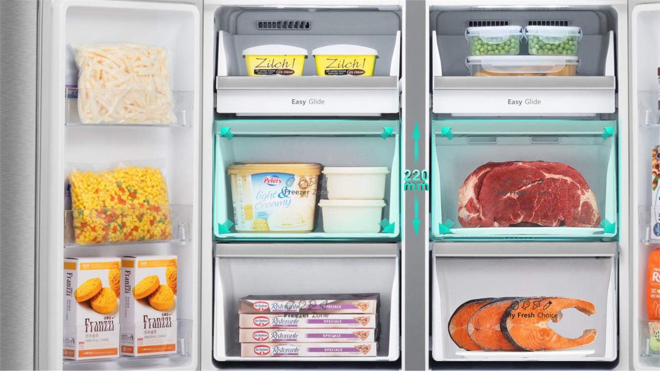 Không gian lớn (cao 220mm) cùng ngăn chứa trong suốt giúp thực phẩm “ngon mắt” hơn, không mất công tìm kiếm thực phẩm. Ngăn kéo cũng dễ dàng tháo rời và vệ sinh & sử dụng dễ dàng giúp bạn lấy thực phẩm một cách nhanh chóng và đơn giản ngay cả khi khay đang chứa đầy thực phẩm