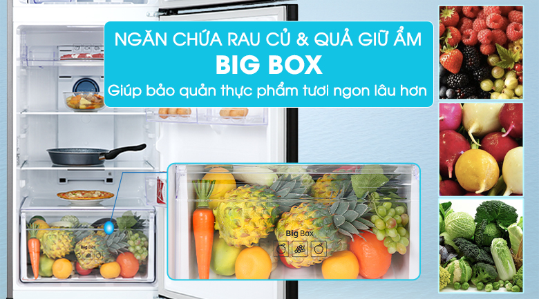 Rau quả luôn tươi ngon khi được trữ trong ngăn rau quả giữ ẩm Big box, hạn chế thất thoát độ ẩm của của thực phẩm, lại trữ được nhiều hơn với dung tích lớn hơn.