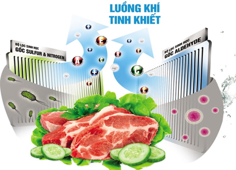 Bên cạnh đó, tủ lạnh Toshibacòn được áp dụng công nghệ khử mùi diệt khuẩn Hybrid Bio hiện đại với cấu tạo màn lọc chứa các phân tử Carbon, chất xúc tác Enzym có khả năng khử và loại bỏ hầu hết các mùi khó chịu của thực phẩm, đặc biệt là các mùi do vi khuẩn gây ra. Ngoài ra, còn cấu tạo ngăn đá khử mùi hiệu quả, đi kèm theo 3 vỉ đựng đá tiện lợi.