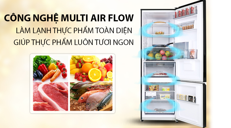Công nghệ luồng khí lạnh đa chiều Multi Air Flow sẽ giúp cho hơi lạnh được lan tỏa và phân bổ đều khắp mọi ngóc ngách bên trong tủ lạnh, nhờ đó thực phẩm được bảo quản lạnh một cách toàn diện và giảm thiểu tình trạng bị ôi thiu do không nhận đủ lạnh hoặc quá lạnh do phân bổ các luồng khí lạnh không đều.
