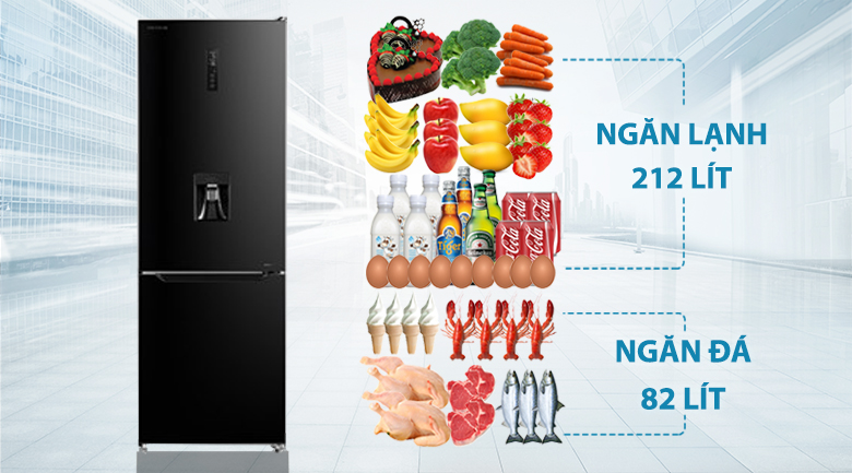 Tủ lạnh Toshiba GR-RB385WE-PMV(30)-BS ngăn đá dưới này sở hữu dung tích 294 lít, phù hợp cho những gia đình khoảng 3 người có nhu cầu lưu trữ thực phẩm với dung tích ngăn đá khoảng 82 lít và dung tích ngăn lạnh khoảng 212 lít.