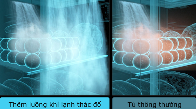Bổ sung thêm luồng khí lạnh thổi xuống từ phía trước kết hợp luồng khí từ phía sau cho khí lạnh tỏa đều khắp tủ. Thực phẩm luôn tươi ngon dù cất trữ bất kỳ vị trí nào ngay cả ở cửa tủ.
