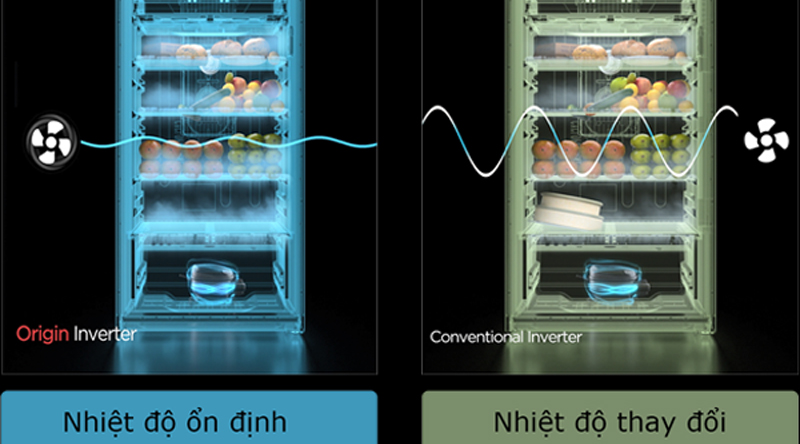 Cả máy nén inverter và quạt inverter hoạt động đồng bộ với nhau. Giúp tủ tiết kiệm điện tối đa, cực kỳ êm ái và duy trì nhiệt độ luôn ổn định.