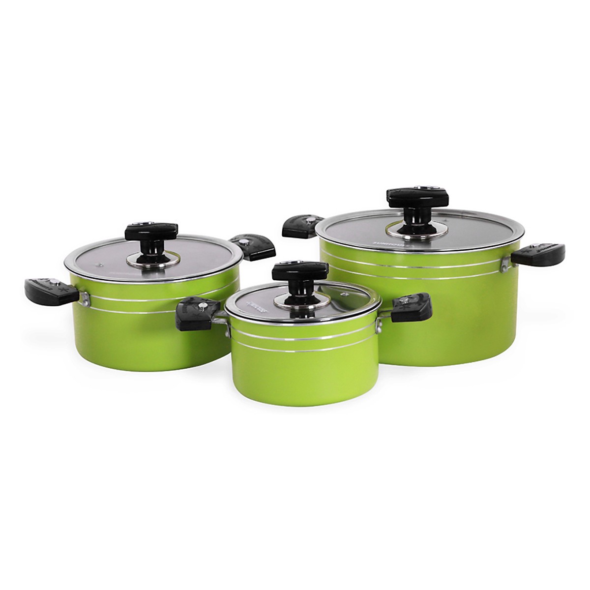 - Thiết kế sang trọng, bắt mắt: Bộ nồi làm từ nhôm tấm cao cấp được phủ 1 lớp sơn tĩnh điện màu xanh lá, hạn chế bám bẩn và dễ dàng vệ sinh, đem lại tổng quan bắt mắt, trông luôn như mới.