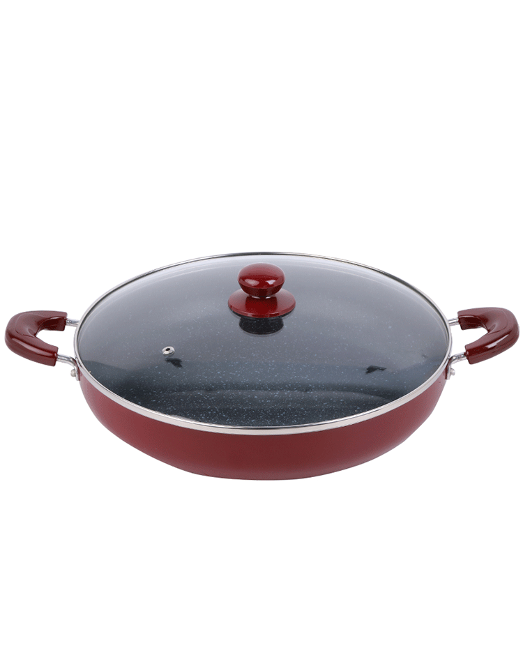Chảo nhôm đá hoa cương hiệu PoongNyun Series Shah Murten màu đỏ 2 quai được đúc từ nhôm 2.2T, bên trong chảo phủ lớp đá hoa cương chống dính, bên ngoài phủ lớp men chống dính màu đỏ, tay cầm được làm bằng nhựa tổng hợp, có nắp kiếng, Sử dụng trên bếp gas, bếp hồng ngoại.