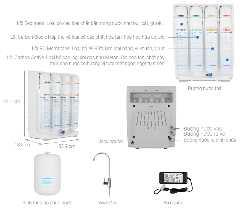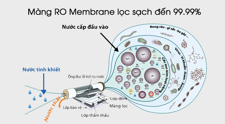 - Lõi RO Membrane: Lọc sạch kim loại nặng, vi khuẩn, vi rút có trong nước.