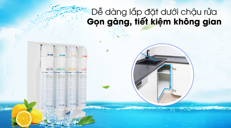 Máy lọc nước Chungho thiết kế lắp đặt âm dưới bồn rửa tiện lợi, gọn đẹp cho không gian sử dụng