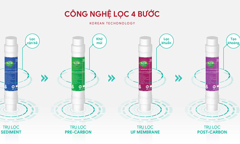 Chế độ lọc 4 bước khép kín từ Hàn Quốc, sử dụng lõi lọc cao cấp giúp: