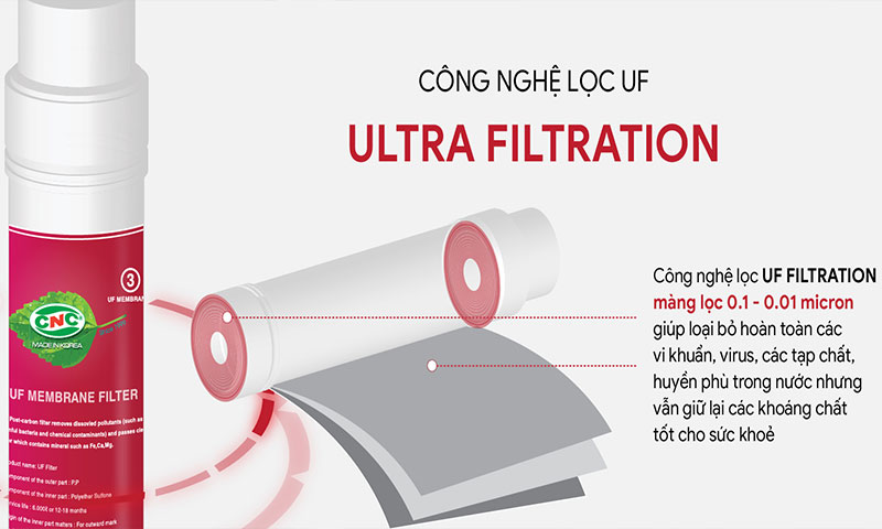 Công nghệ lọc UF Filtration màng lọc 0.1 - 0.01 micro giúp loại bỏ hoàn toàn các vi khuẩn, virus, các tạp chất, huyền phù trong nước nưng vẫn giữ lại các khoáng chất tốt cho sức khỏe.