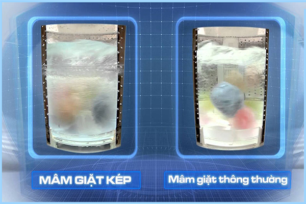 2 mâm giặt kép đem lại hiểu quả giặt sạch đáng kinh ngạc. Mâm giặt bên trong xoay tự do, gánh đỡ phần lớn sức nặng của quần áo, mâm giặt bên ngoài dể dàng xoay, tạo nên lực xoáy nước mạnh mẽ, giúp đảo trộn quần áo tốt hơn, nâng cao hiệu quả giặt sạch.