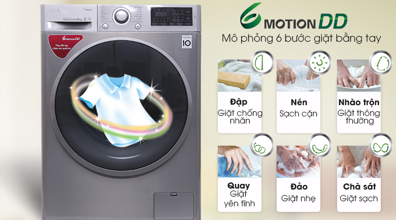 Công nghệ 6 Motion DD là công nghệ giặt mới mẻ, được thực hiện dựa vào sự tương tác hỗ trợ của động cơ Inverter DD của LG. Nhờ có công nghệ này mà giúp điều khiển tốc độ quay và hướng quay của lồng giặt, thực hiện được chuyển động linh hoạt, từ đó quần áo của bạn luôn sạch sẽ và thơm tho