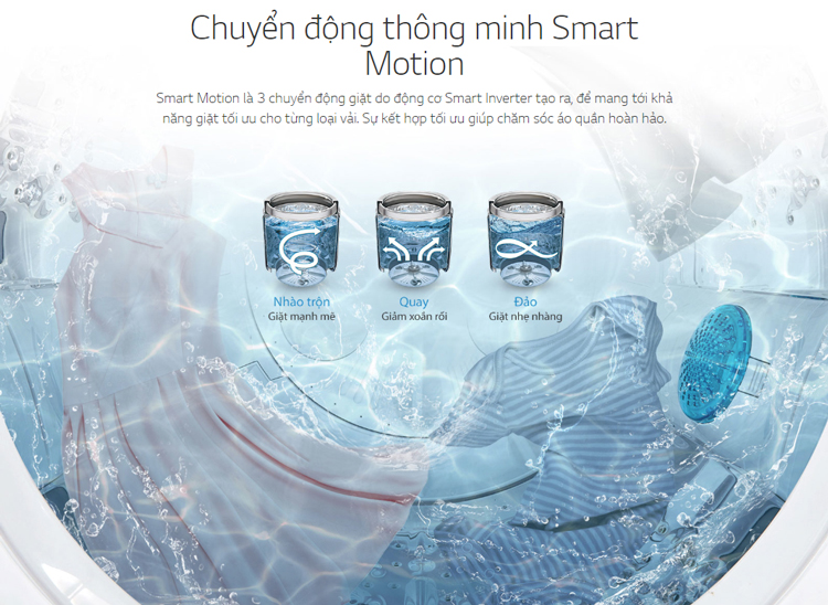 Máy giặt LG T2108VSPW còn sử dụng tính năng Smart Motion với 3 chuyển động giặt do động cơ Smart Inverter tạo ra, để mang tới khả năng giặt tối ưu cho từng loại vải. Sự kết hợp tối ưu giúp chăm sóc áo quần hoàn hảo.