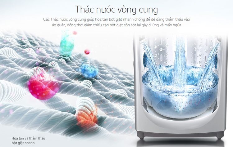 Với LG T2108VSPW, các thác nước vòng cung sẽ giúp hòa tan bột giặt nhanh chóng để dễ dàng thẩm thấu vào áo quần, đồng thời giảm thiểu cặn bột giặt còn sót lại gây dị ứng và mẩn ngứa.
