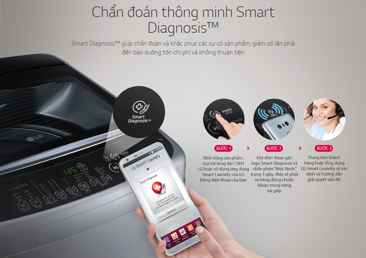 Bên cạnh đó, sản phẩm được tích hợp chức năng chẩn đoán thông minh Smart Diagnosis, chức năng này giúp chẩn đoán và khắc phục các sự cố sản phẩm, giảm số lần phải đến bảo dưỡng tốn chi phí và không thuận tiện. Bạn chỉ cần có một chiếc Smartphone, là có thể sử dụng chức năng này ngay tại nhà vô cùng tiện lợi, nhanh chóng.