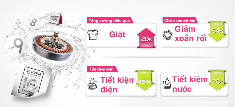 LG đã nâng cấp tính năng truyền động trực tiếp bằng bộ đảo lưu với công nghệ mới nhất. Động cơ được cải tiến có hiệu suất giặt tốt hơn, cho phép bạn giặt nhiều loại quần áo khác nhau hiệu quả hơn và ít bị hỏng hơn. Ngoài ra, động cơ Inverter thế hệ mới còn giúp cho máy giặt hoạt động êm ái hơn, tiết kiệm đến 45% điện năng và 25% lượng nước tiêu thụ trong mỗi lần giặt.