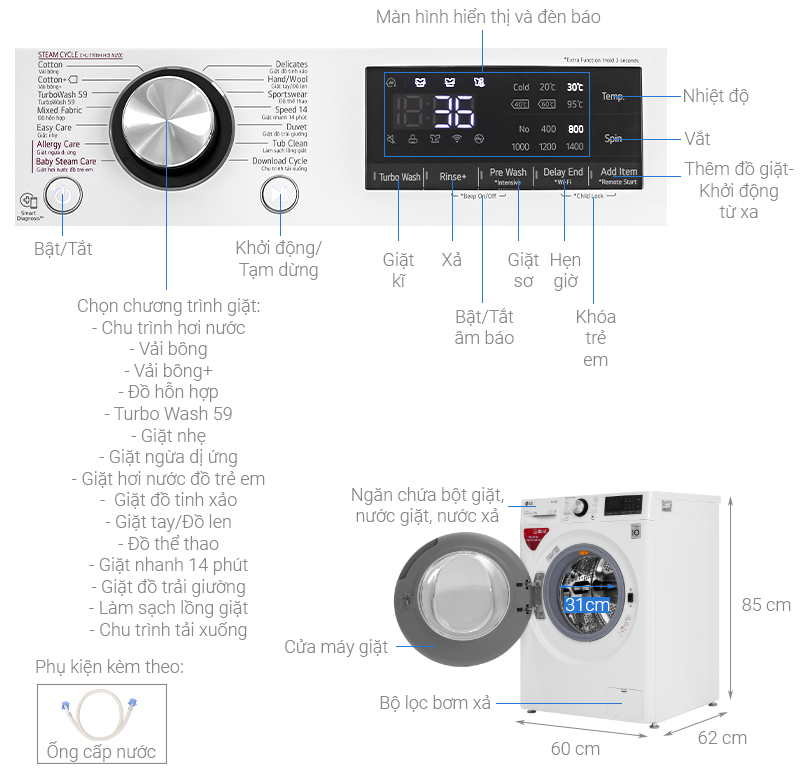 Công nghệ TurboWash của máy giặt LG sử dụng đầu phun nước phun trực tiếp lên quần áo với áp suất cao, giúp bột giặt thấm sâu loại bỏ tốt các vết bẩn cứng đầu, rút ngắn thời gian giặt.
