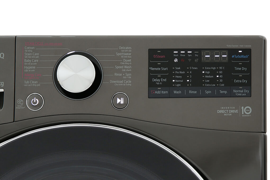 Máy giặt sấy LG F2515RTGB đi kèm với bảng điều khiển song ngữ Anh - Việt, có nút xoay, nút nhấn và màn hình hiển thị thông minh, giúp bạn dễ dàng chọn chương trình giặt sấy và theo dõi quá trình giặt một cách thuận tiện. Ngoài ra, còn tích hợp khóa trẻ em và cho phép điều khiển từ xa qua ứng dụng SmartThinQ, giúp bạn điều khiển máy từ bất kỳ đâu mà không cần phải đứng trước máy.