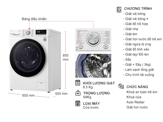 Khối lượng giặt của máy giặt sấy LG Inverter 8.5 kg FV1408G4W lên đến 8.5 Kg. Sấy được khoảng 5 Kg quần áo.