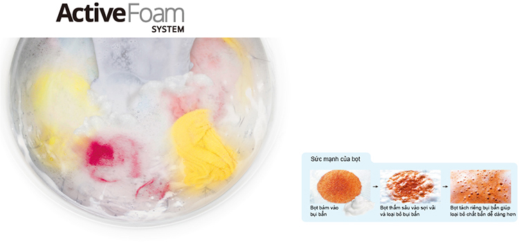 Đặc biệt với hệ thống ActiveFoam tạo bọt mịn, đậm đặc trước khi chu trình giặt bắt đầu. Bọt mịn đánh tan, tách riêng và loại bỏ bụi bẩn từ sâu bên trong sợi vải. Hộp đánh tan bột giặt Turbo mixer mới hòa tan bột giặt để tạo bọt mịn giúp tăng hiệu quả giặt tẩy.