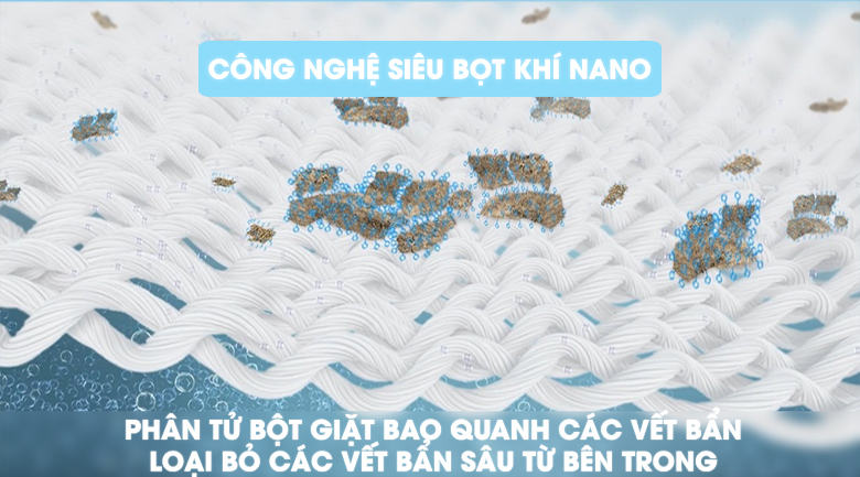 Công nghệ siêu bọt khí Nano (UFB) của máy giặt Inverter Toshiba tạo ra các bọt khí có kích thước Nano siêu nhỏ, nhỏ hơn 200 lần so với khe hở giữa các sợi vải, dễ dàng thấm sâu, loại bỏ các chất bẩn một cách hiệu quả.