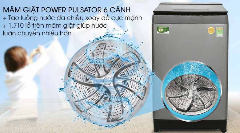 Đột phá với mâm giặt Power tạo luồng nước xoay chiều cực mạnh. Đồ giặt di chuyển nhẹ nhàng, vết bẩn sẽ được làm sạch tối đa, nâng cao hiệu quả giặt tẩy. Thiết kế mâm giặt Power mới 6 cánh độc đáo tạo luồng nước đa chiều xoay đồ giặt cực mạnh cùng việc gia tăng gần 1,710 lỗ trên mâm giặt giúp nước luân chuyển nhiều hơn, xà phòng dễ dàng thấm sâu vào từng sơn vải nâng cao hiệu quả giặt tối ưu.