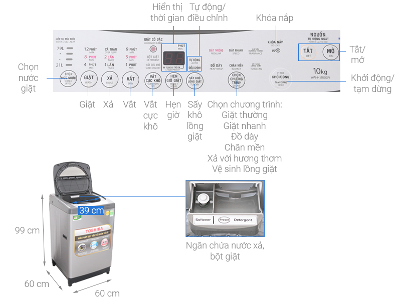 Chiếc máy giặt cửa trên, lồng đứng này sẽ giúp bạn giải quyết hoàn toàn vấn đề giặt giũ của gia đình. Khối lượng giặt 10kg phù hợp cho các gia đình có trên 6 thành viên.