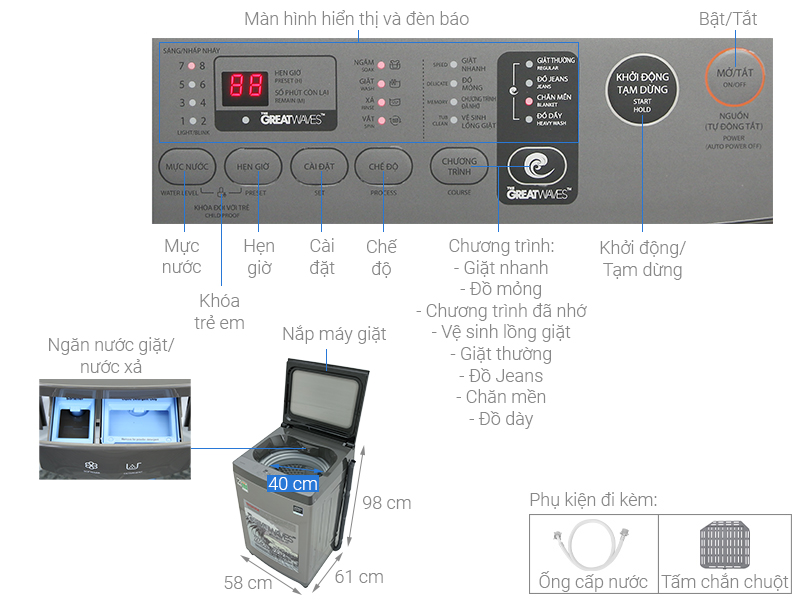 - Luồng nước thổi lên: Bảo vệ quần áo và chống sờn sợi vải.