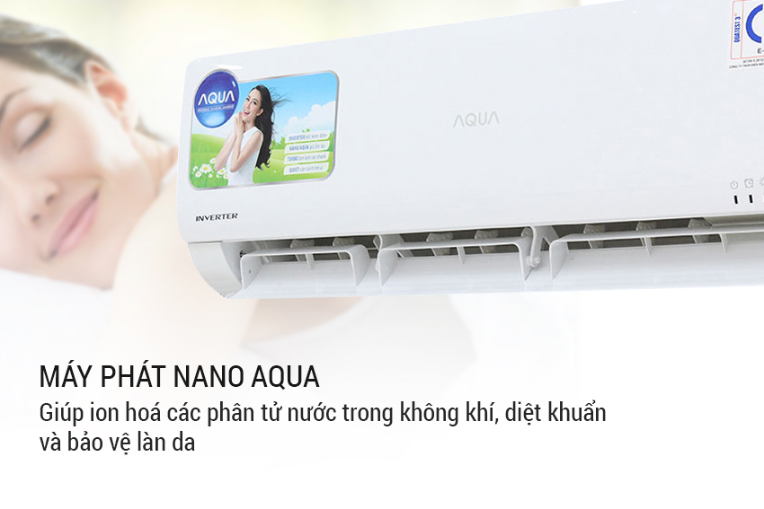 Máy lạnh Aqua AQA-KCRV9WGSA sử dụng công nghệ “máy phát Nano Aqua” hiện đại, giúp ion hoá các phân tử nước trong không khí, hỗ trợ diệt khuẩn và lọc sạch không khí, đồng thời tăng khả năng giữ ẩm cho làn da của bạn.