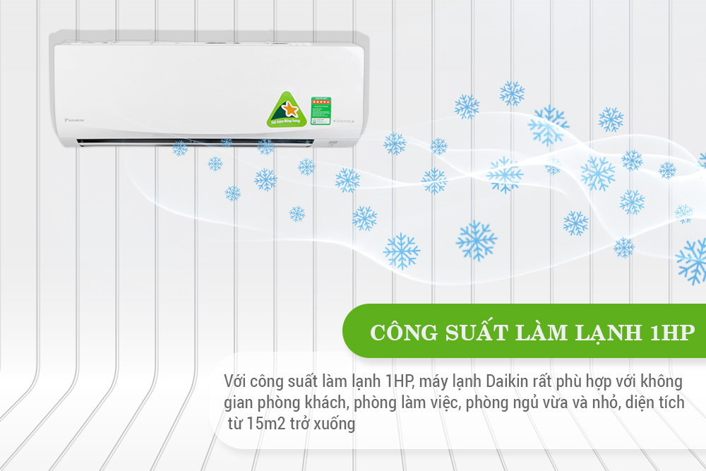 Với công suất làm lạnh 1HP, máy điều hòa Daikin rất phù hợp với không gian phòng khách, phòng làm việc, phòng ngủ vừa và nhỏ, diện tích từ 15m2 trở xuống.