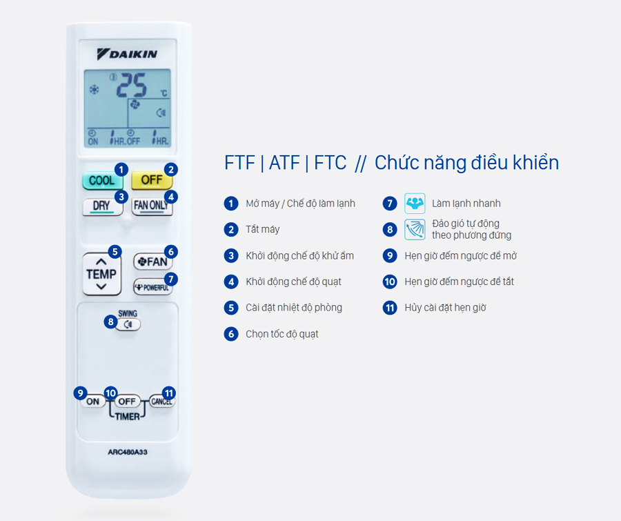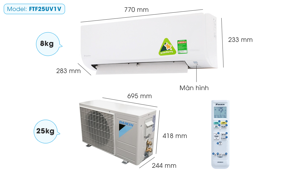 Máy lạnh Daikin FTF25UV1V có công suất làm lạnh 9000 Btu/h (thích hợp phòng có diện tích 10 - 15 m² hoặc từ 30 - 45 m³ khí).