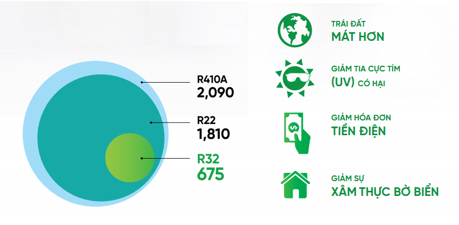 Máy lạnh inverter Daikin FTKA25UAVMV được sử dụng chất làm lạnh R-32 không phá hủy tầng Ô-zôn (ODP) và chỉ số làm nóng lên toàn cầu (GWP) chỉ bằng 1/3 so với chất làm lạnh R-410A và R-22.