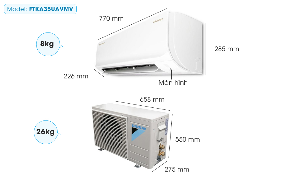 Máy lạnh Daikin FTKA25UAVMV có công suất làm lạnh 9000 Btu/h (thích hợp phòng có diện tích 10 - 15 m² hoặc từ 30 - 45 m³ khí).