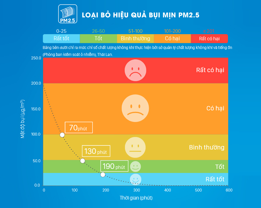 Khử mùi và loại bỏ chất gây dị ứng mang lại bầu không khí trong lành cho gia đình. LOẠI BỎ HIỆU QUẢ BỤI MỊN PM2.5 lọc sạch không khí trong nhà ở mức “Rất tốt”trong vòng190 phút.