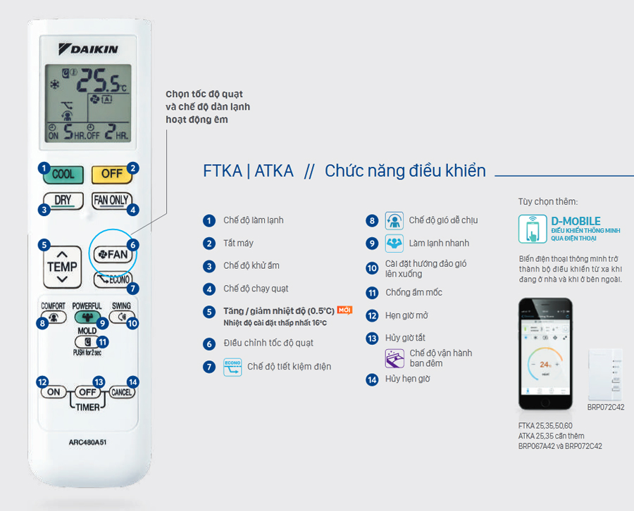 Máy lạnh Daikin FTKA25UAVMV Inverter có tính năng chống ẩm mốc: Sau khi tắt máy, trong vòng 1 giờ quạt sẽ hoạt động giúp loại bỏ những hơi ẩm còn lại bên trong dàn lạnh, ngăn sự phát triển của nấm mốc, mùi hôi và tăng độ bền của máy.