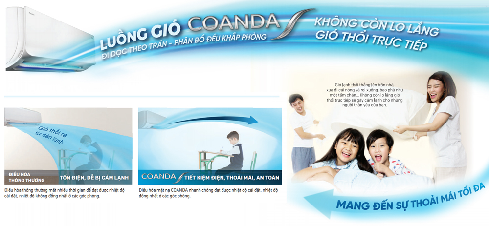Không còn lo lắng luồng gió từ máy lạnh thổi trực tiếp vào cơ thể khiến người thân yêu trong gia đình bị cảm lạnh, với công nghệ COANDA mang đến sự thoải mái khi luồng gió dọc theo trần nhà và trải đều khắp căn phòng, cánh đảo gió hướng lên trên, gió lạnh sẽ rơi xuống, che phủ bạn như một tấm chăn.