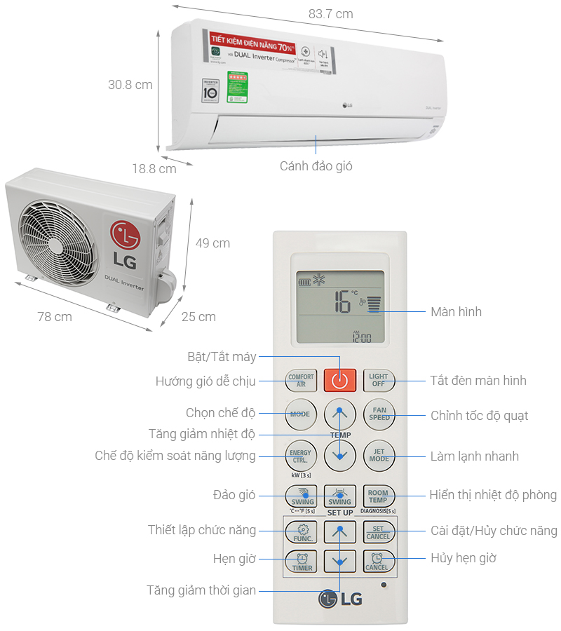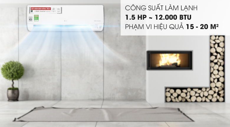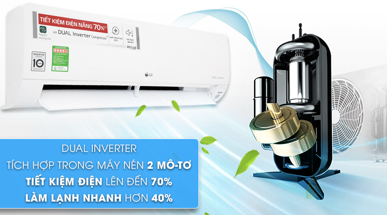 Là một chiếc máy lạnh Inverter, máy lạnh LG V13APH được ứng dụng công nghệ Dual Inverter cho khả năng làm lạnh nhanh chóng, ổn định nhưng vẫn góp phần tiết kiệm lên đến 70% điện năng tiêu thụ cho gia đình.