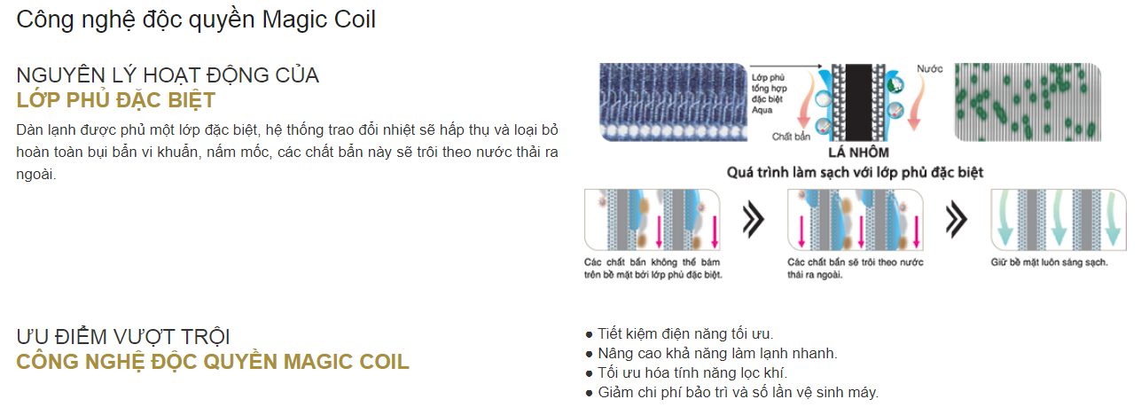 Công nghệ Magic Coil giúp ngăn chặn, không cho bụi bẩn bám trên bề mặt ngoài của lá nhôm, hạn chế sự phát triển của nấm mốc, vi khuẩn, từ đó tạo ra những luồng không khí trong lành, bảo vệ sức khỏe cho cả gia đình.