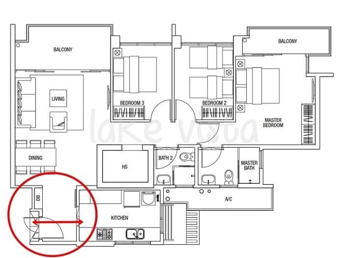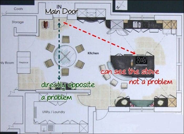 Cửa trước và cửa bếp (hoặc bếp) không nên tạo thành một đường thẳng. Nếu bạn vào cửa trước và có thể nhìn thấy bếp lò hoặc nhà bếp ở bên cạnh, thì đó không phải là vấn đề lớn.