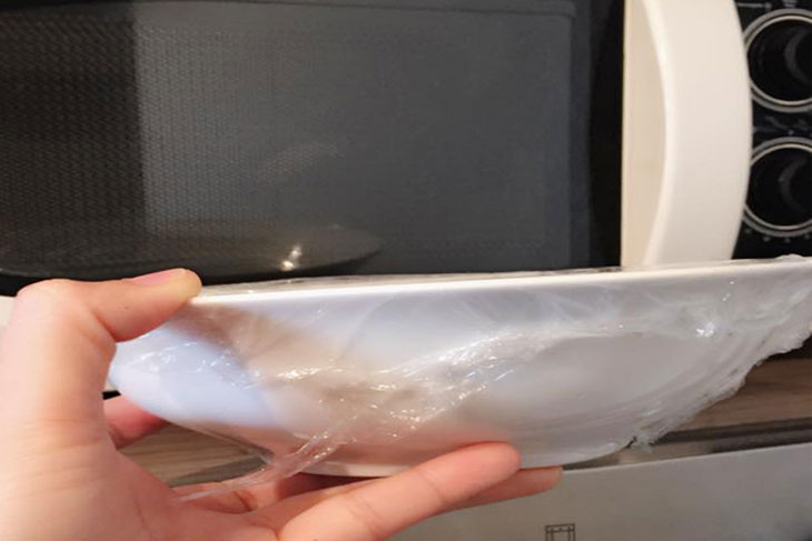 Hấp bằng lò vi sóng: Bạn cũng có thể cho cơm nguội vào tô thủy tinh, bọc kín màng thực phẩm và cho vào nồi vi sóng để cơm lại thơm ngon như mới nấu.