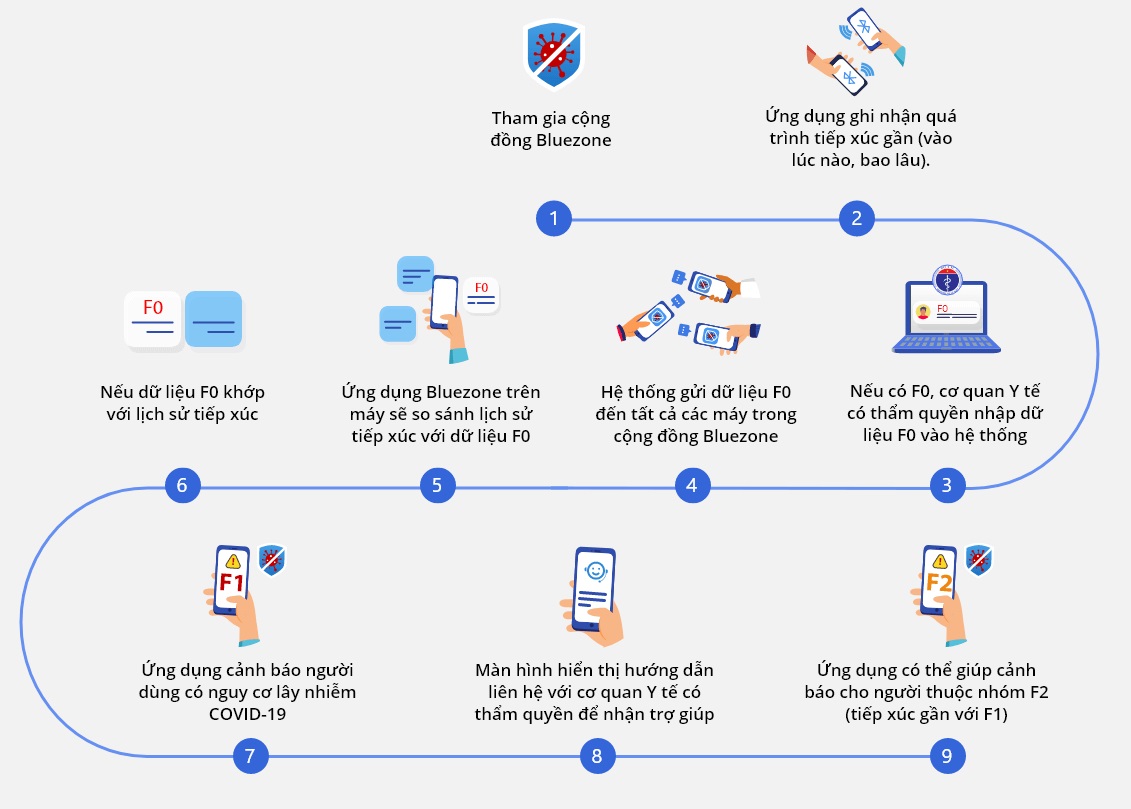 Bluezone là ứng dụng có khả năng truy vết nhanh những người có nguy cơ lây nhiễm Covid-19. Đồng thời, cảnh báo nếu người dùng tiếp xúc gần với người nhiễm virus corona.