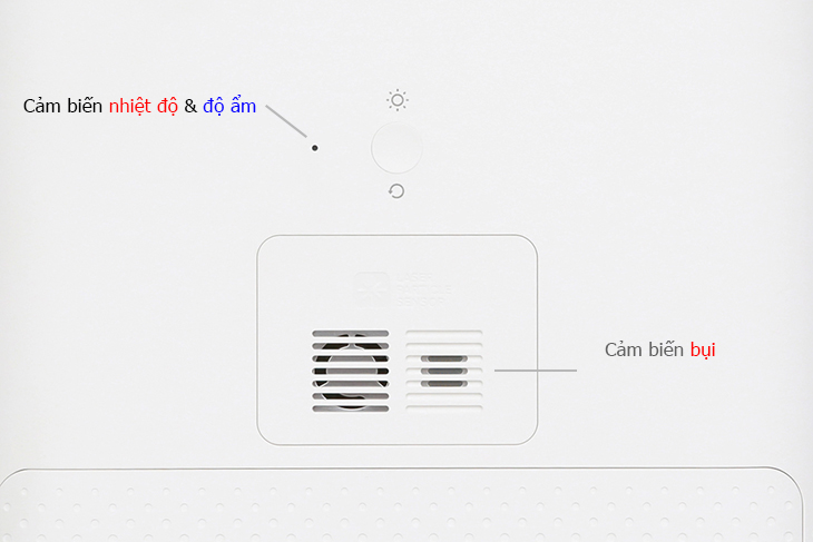 Bên cạnh phím nguồn là cảm biến ảnh sáng, đây là bộ phân giúp máy lọc không khí có thể nhận biết ngày/đêm và để máy có thể chuyển sang chế độ hoạt động êm hơn nếu về đêm.