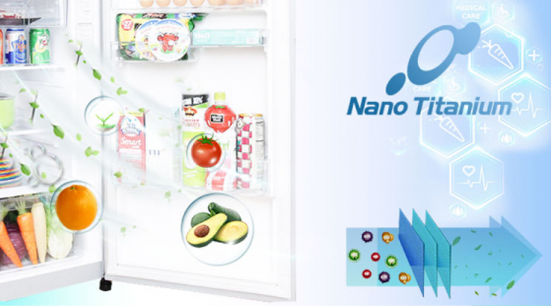 Chất xúc tác TiO2 có tác dụng vô hiệu hoá vi khuẩn và khử mùi hiệu quả giúp không gian bên trong tủ lạnh hoàn toàn trong lành.